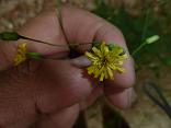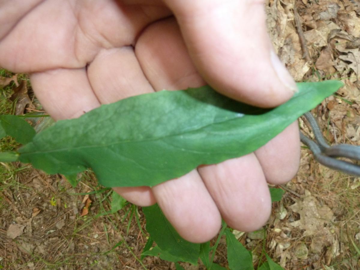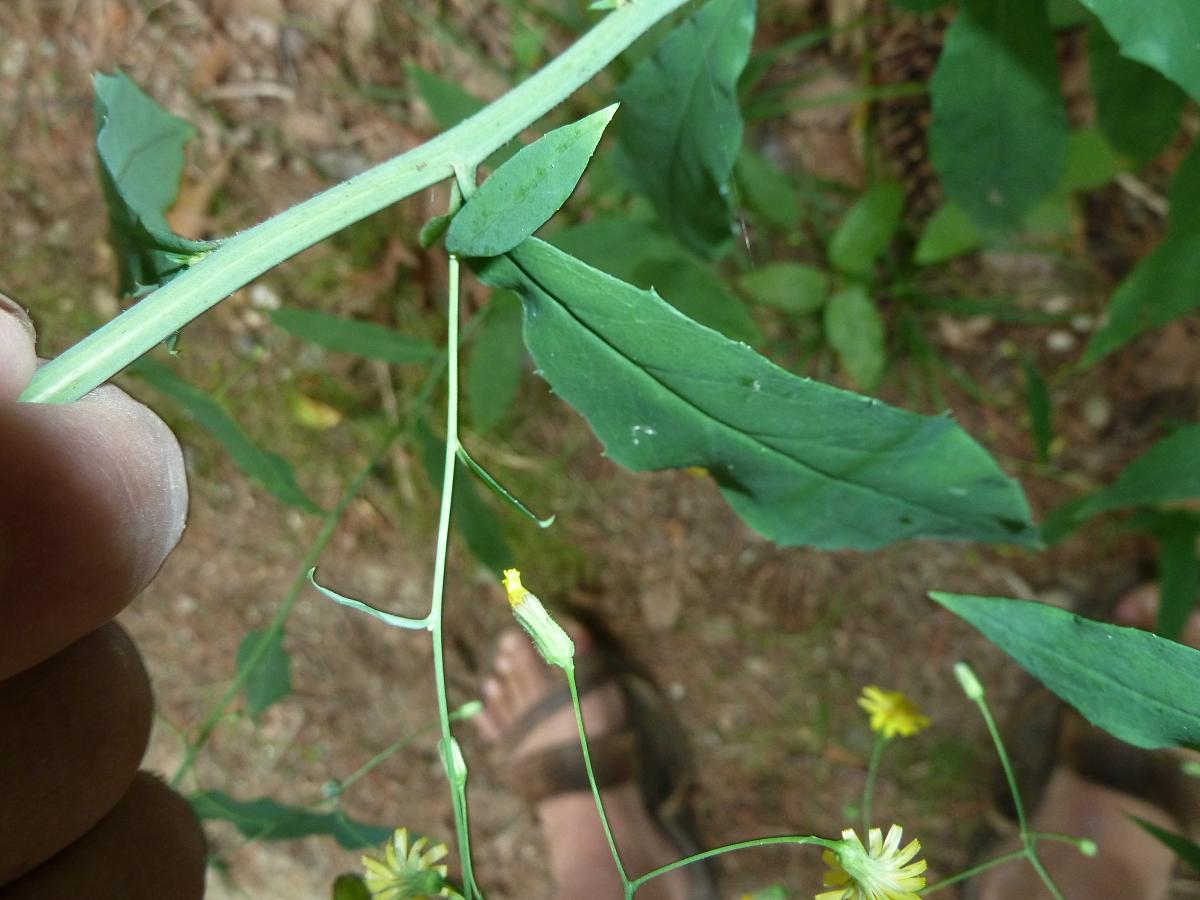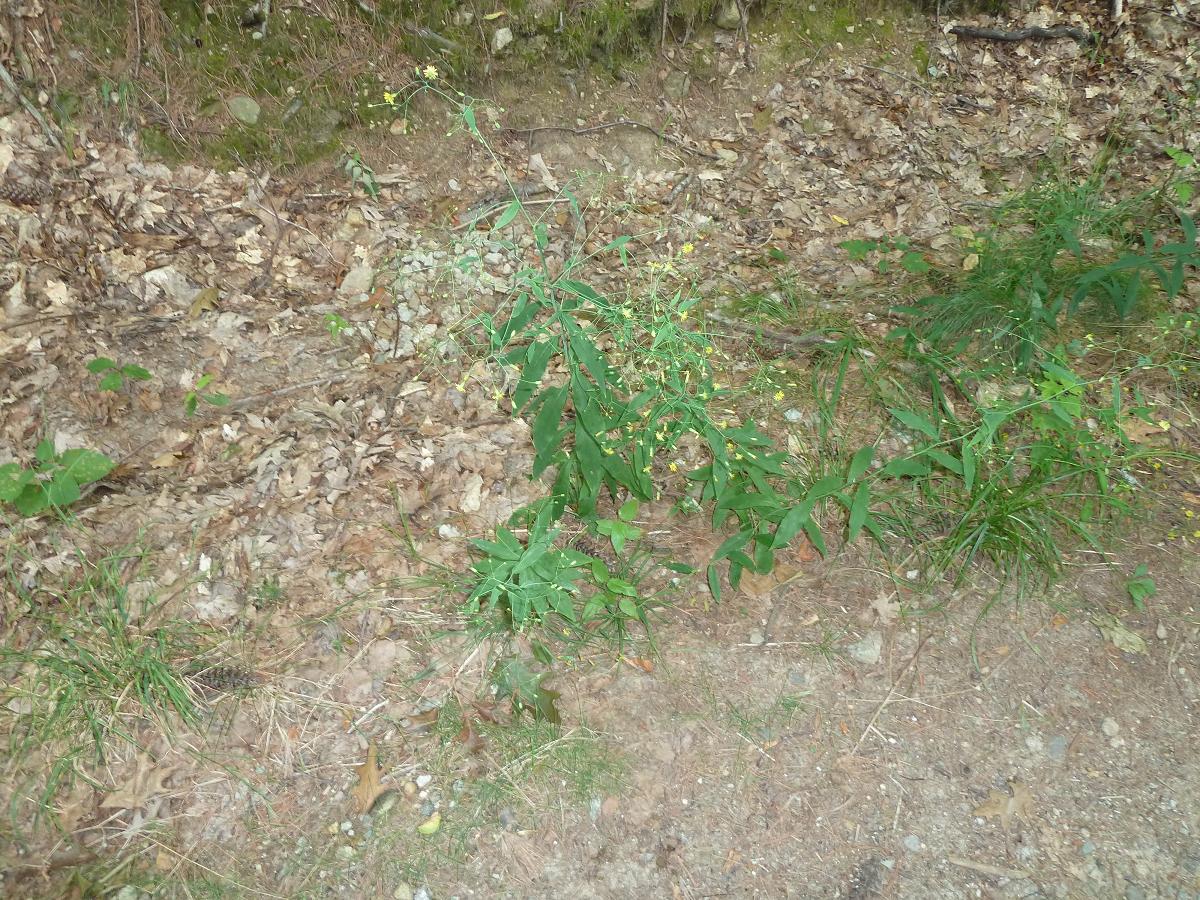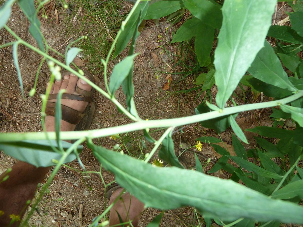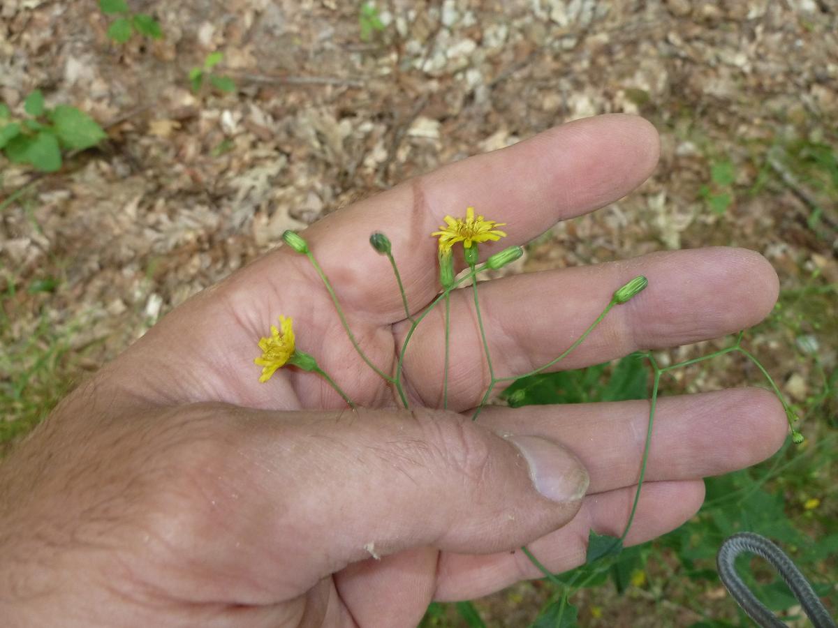 Kalm’s Hawkweed has a lower stem and underside of leaves with long hairs. In most pictures, it appears that the flower stem grows a foot or more above the stem leaves and the flower stems do not droop much. The Kalm’s Hawkweed leaves look a bit like my pictures except they are shorter and wider (proportionally). Common Hawkweed has mostly larger basal leaves with 4-7 sessile stem leaves. The 2-1/2 foot tall stem is topped by 4-12 yellow flowers in a round-topped cluster. Flower heads have white hairs around the base (like Robinson’s Hawkweed). The leaves of Common Hawkweed have larger teeth than this plant. This left me with a description of Allegheny Hawkweed that closely matched the pictures and an online image from florafinder.com that looks just like this plant: Largely solitary stems (up to 3 feet tall) with stem leaves up into the inflorescene and few to no basal leaves. The stem is mostly hairless (ocassional hairs). The leaves are papery thin and have an irregularly-tooth margin (few teeth). The underside of the leaves are slightly whitened. The inflorescense at the top contains up to 20 flowers on thin, flexible and mostly hairless peduncles (flower stalks). The flowers are up to 1.5 cm (3/5 inches) wide, while those of other hawkweeds can be up to 1 inch wide. The smaller flowering heads, slender and flexible flower stalks and papery thin and mostly hairless leaves are distinguishing characteristics. |